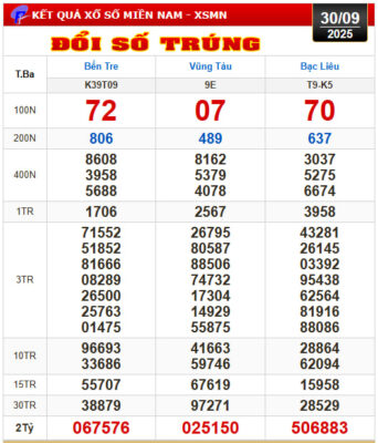 - XSMN thứ 3 tỉnh Bến Tre, Vũng Tàu, Bạc Liêu